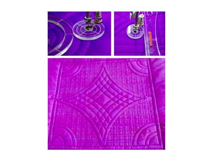 Cuando utilizas los adaptadores eco-quilt estás acolchando alrededor de un motivo para enmarcarlo. Con esta finalidad estos adaptadores se van guiando a lo largo de las reglas cuando se trabaja con movimiento libre. Esta técnica es denominada ‘eco-quilt’.