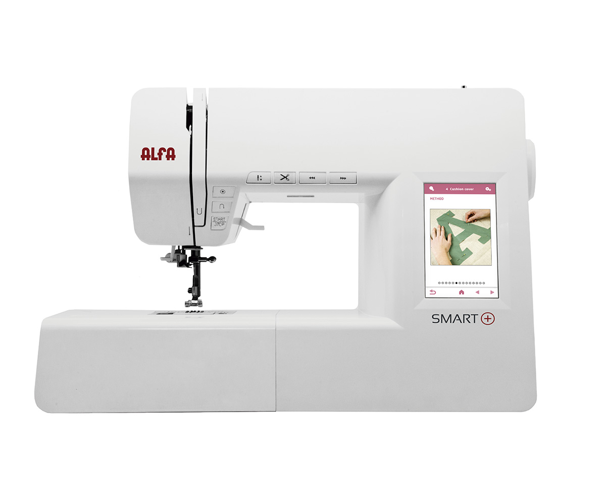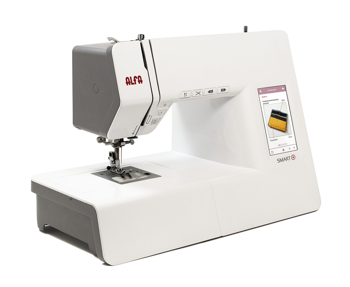Máquina de coser electrónica Alfa Smart Plus reacondicionada. Pantalla táctil con menú Ideas con proyectos paso a paso y patrones descargables. Más de 100 puntadas y 1 alfabeto completo (172 caracteres). Menú Experto con guías de técnicas. 7 filas de dientes de arrastre, enhebrador automático, cortahilos automático, regulador de velocidad, botón Start/Stop, 2 luces LED. Incluye 7 prensatelas, 3 canillas y funda.