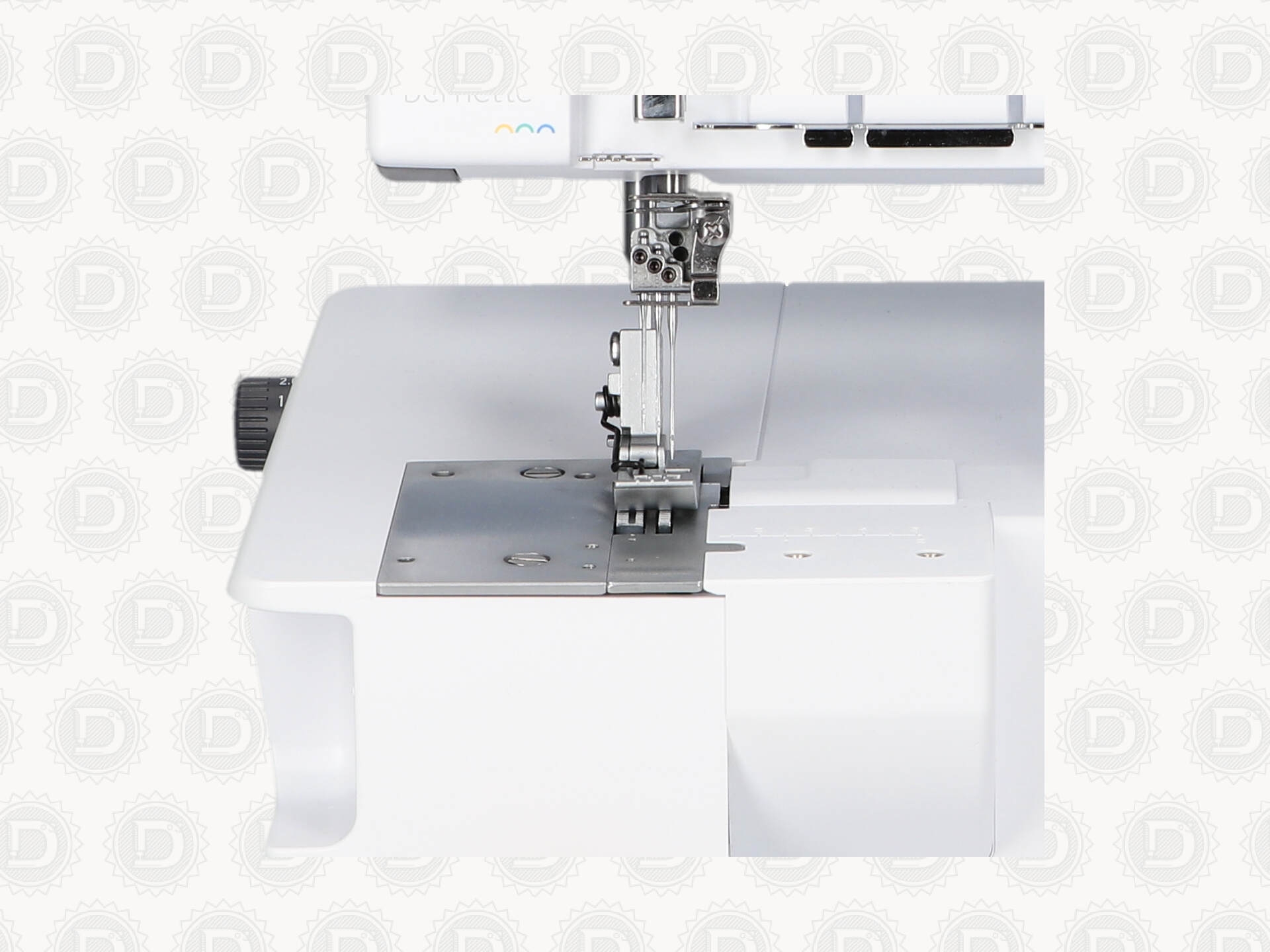 Amplia zona de trabajo para grandes proyectos de costura. Con sus 87 mm de espacio para pasar la tela a la derecha de la aguja, la bernette Funlock 42 también proporciona mucho espacio para aquellos proyectos de costura más grandes.