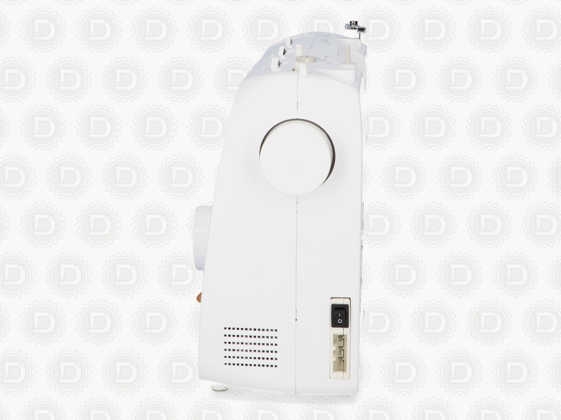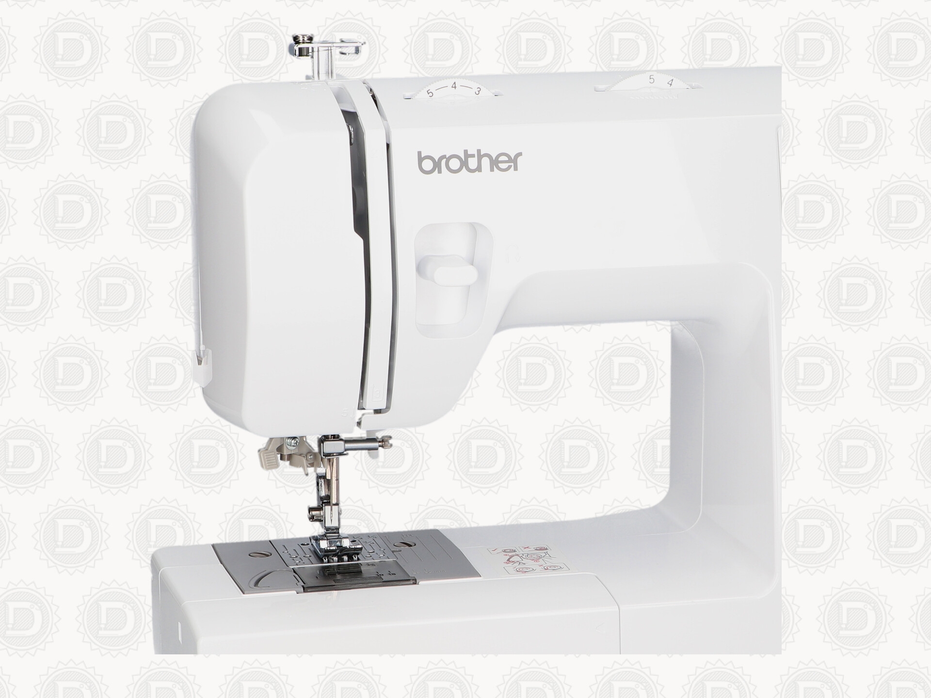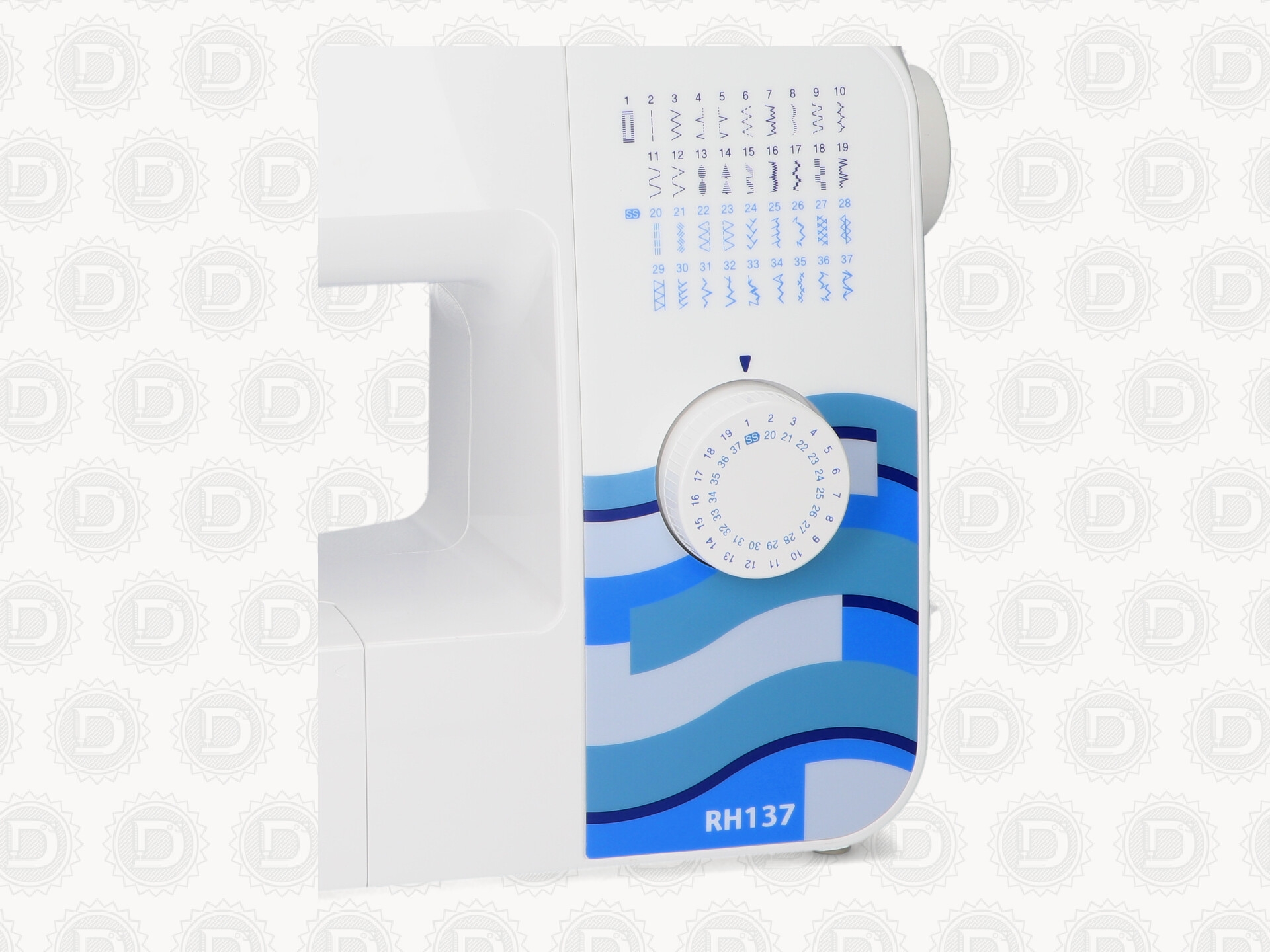 Con selector de diseños que gira en sentido circular para seleccionar el diseño que queremos realizar. Consta de 2 botones para ajustar el largo y ancho de la puntada.