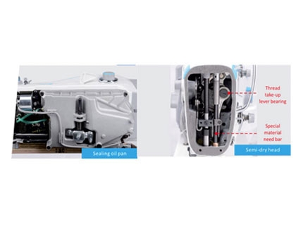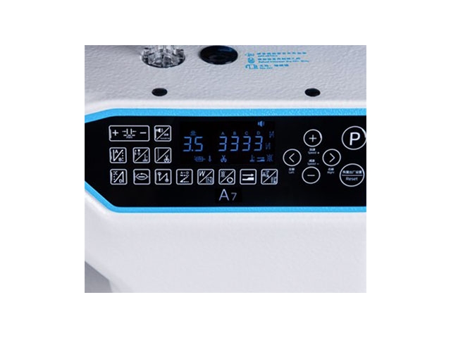 Equipada con cortahílos, cárter cerrado de aceite y cabezal semi-seco, panel de programación, condensación de puntadas, pulsador de puntadas, regulador de longitud de puntada electrónico, remate electrónico silencioso, instrucciones habladas, alzaprensatelas automático, ajuste electrónico de los dientes de arrastre, luz LED integrada, sistema IoT y motor Direct Drive. Incorpora un sistema cortahílos doble, dejando la hebra del hilo inferior a 3,5 mm.
