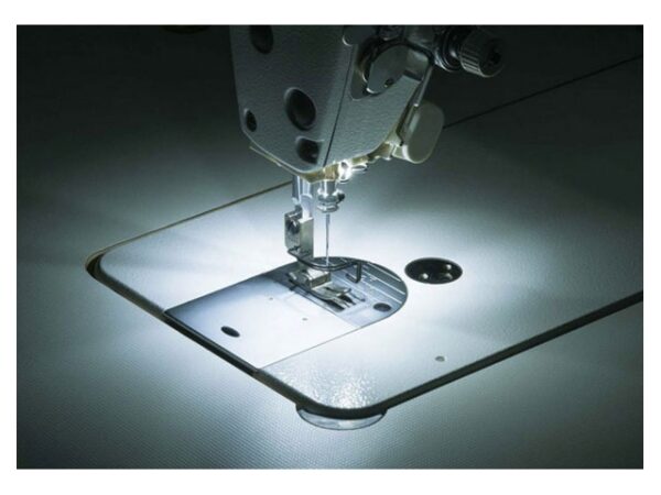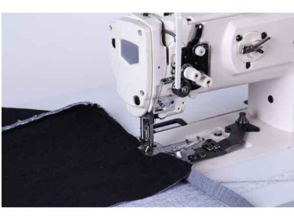 Máquina de pespunte de 1 aguja cortahílos Direc Drive, con sistema de arrastre electrónico (por el panel seleccionaremos el tipo de arrastre deseado, según el grosor del tejido.), panel integrado en el cabezal y carter cerrado.
