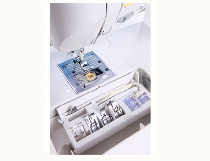 La posibilidad de quitar el brazo para coser costuras circulares, en este ademas podremos guardar los accesorios de la máquina, como los prensatelas, las canillas…