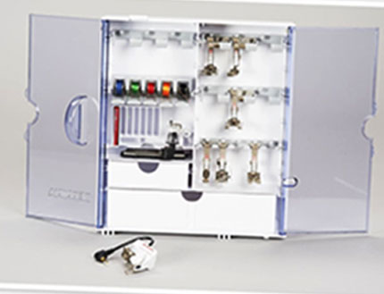 La práctica caja de accesorios permite guardar todos los utensilios de costura, como los prensatelas, las agujas y las canillas. También tiene espacio para prensatelas más grandes como el prensatelas de los ojales. Los soportes para los prensatelas se pueden ajustar individualmente. Los cajones también ofrecen mucho espacio de almacenamiento para guardar las herramientas y pequeños utensilios de costura.