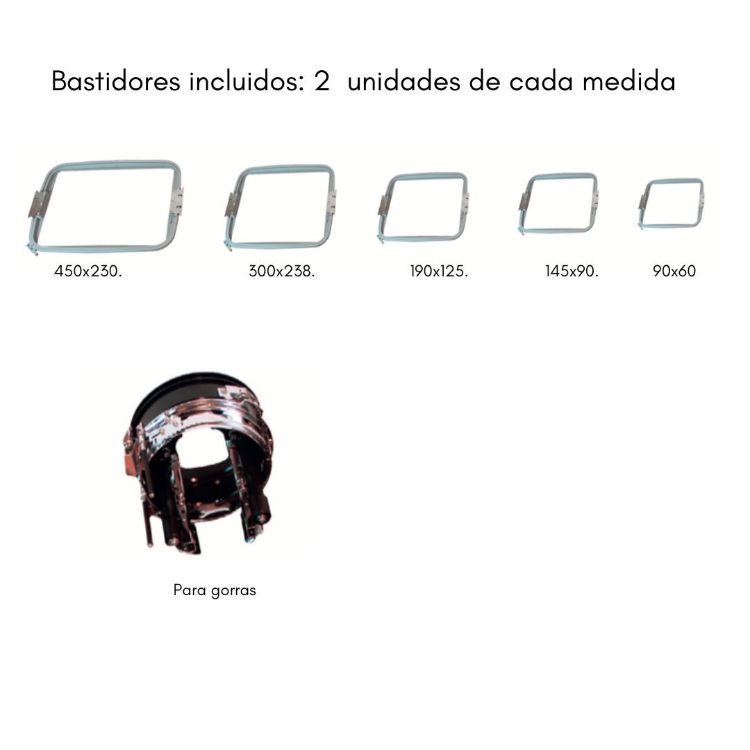 - Velocidad máxima de bordado 1000 ppm en plano y 500 ppm en gorras.