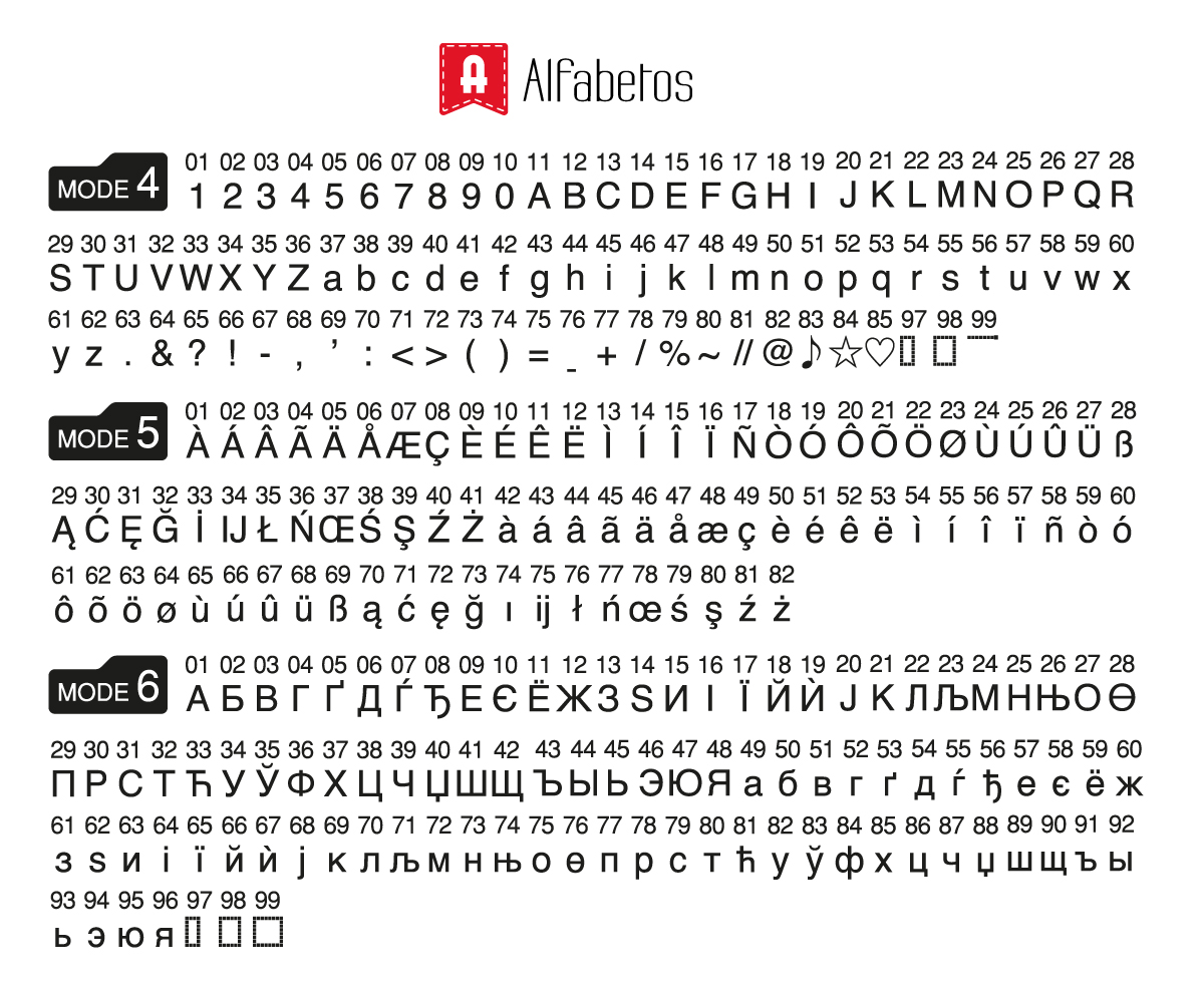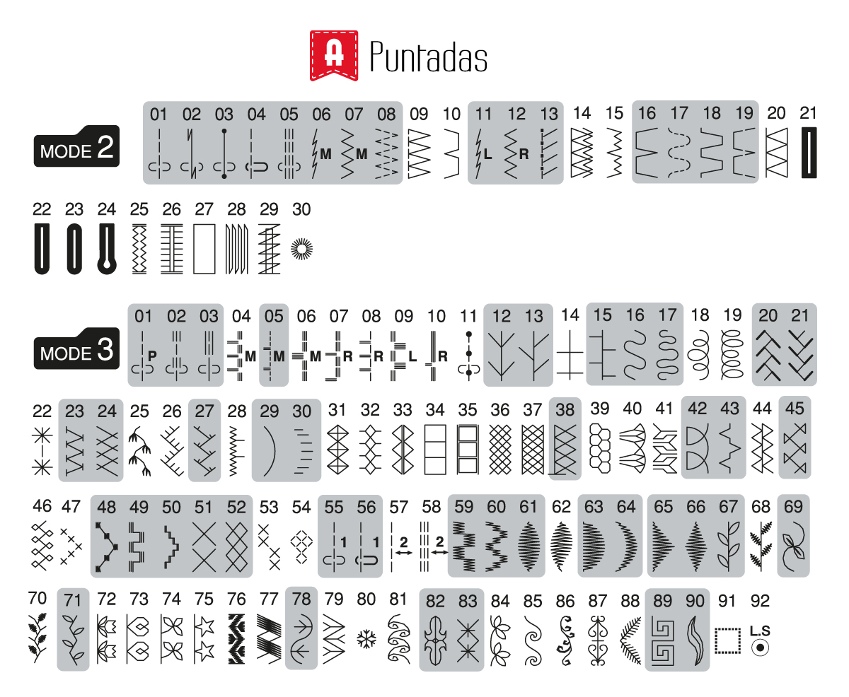 Cuenta con los diseños de puntada más usuales. 10 diseños de costura. 20 diseños de costura y puntada overlock, 7 tipos de ojales diferentes, zurcido, presillas. Diseños de puntadas decorativas entre ellas 92 diseños de costura, decorativa , puntada de apliques, para acolchado, puntada para unión de tejidos y para punto de cruz. Abecedario, número y símbolos europeos. 99 diseños diferentes. Letras acentuadas , 82 diseños diferentes, alfabeto cirílico y símbolos.