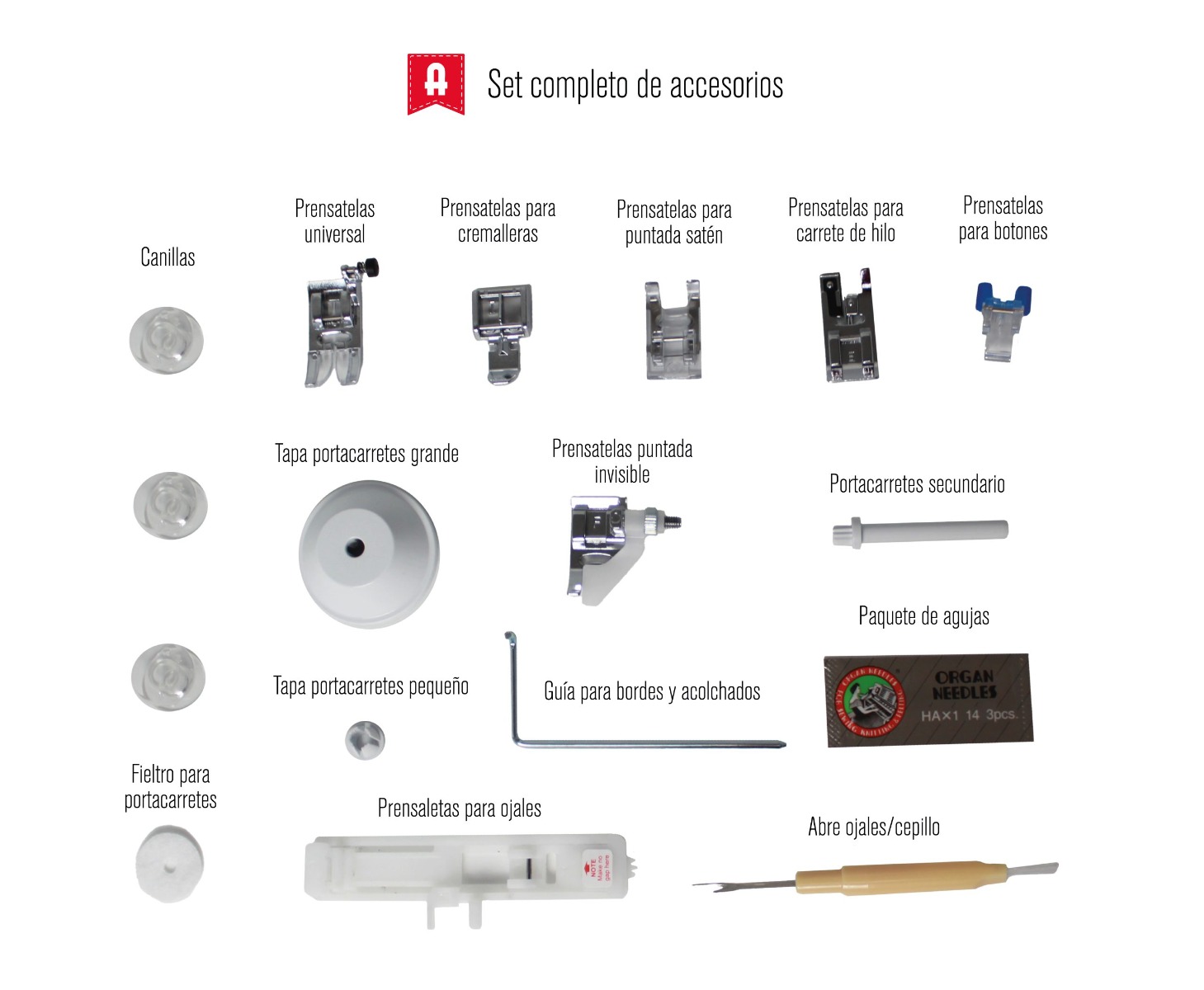 - Accesorios Adicionales: Agujas, bobinas, destornillador, y otros accesorios esenciales para comenzar a coser de inmediato.