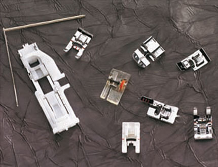 - Kit de accesorios con canillas, destornillador, abreojales, juego de agujas, 8 prensatelas y una guía de acolchado.