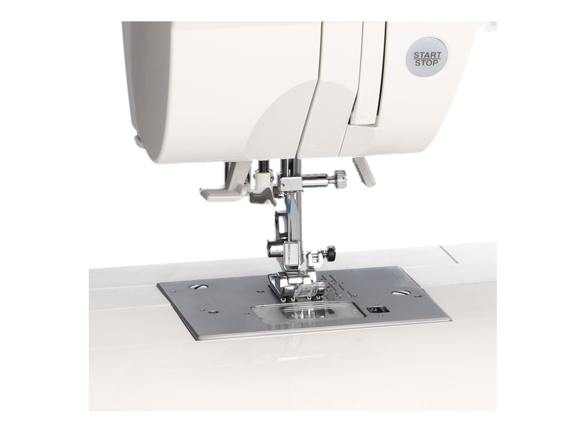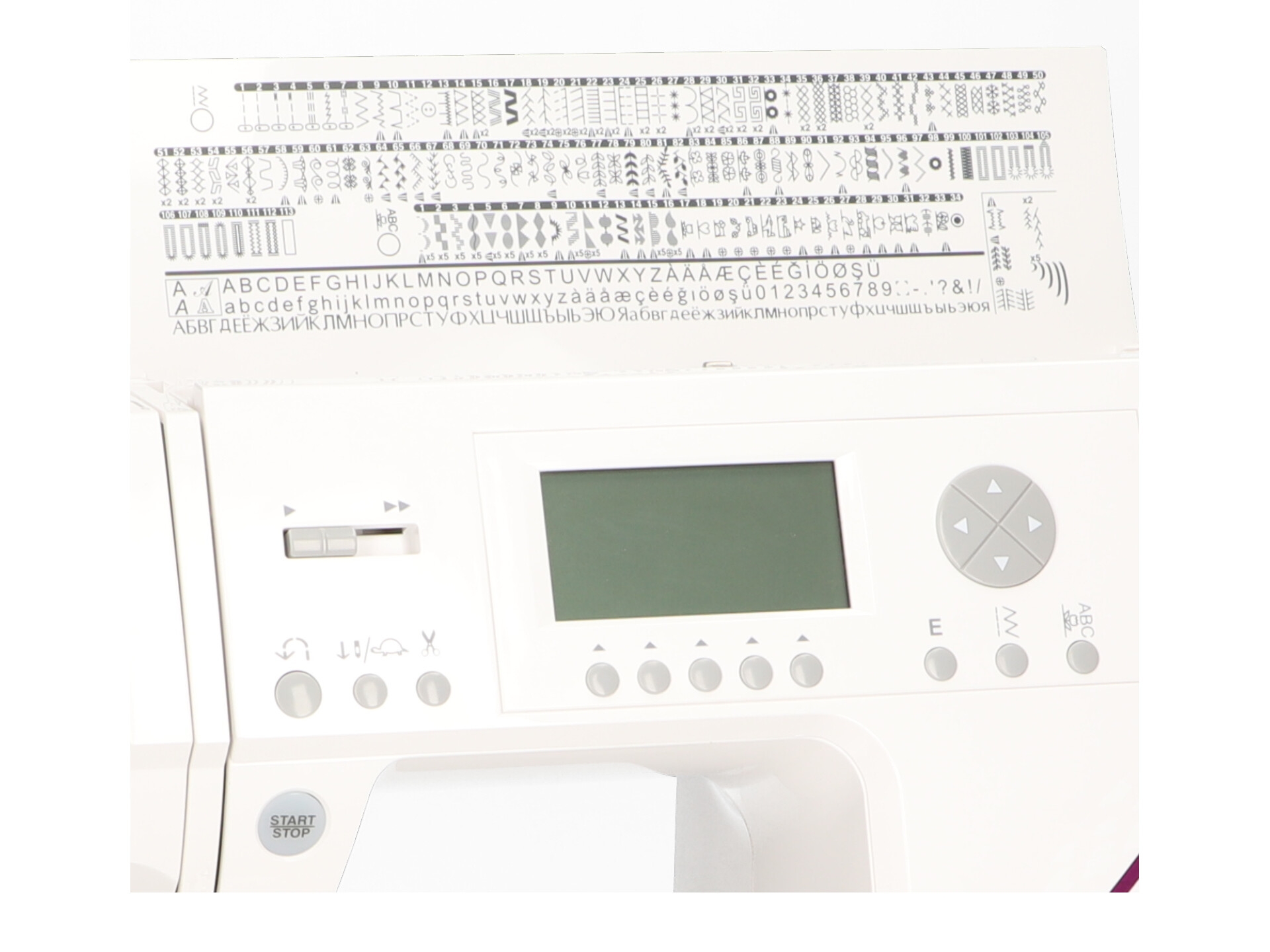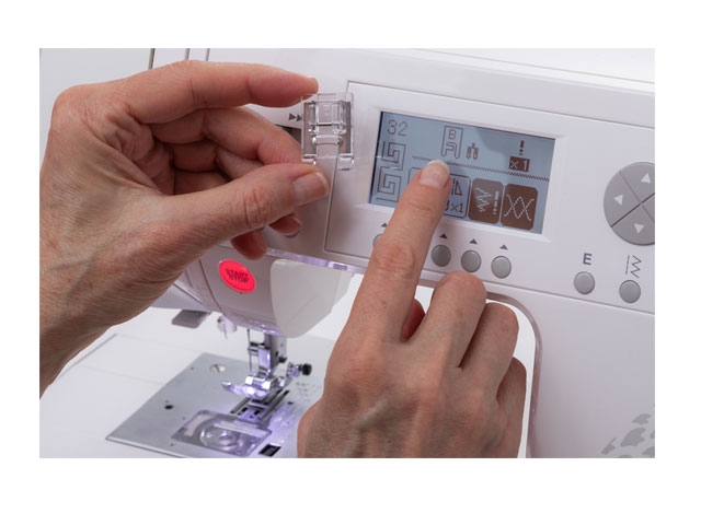 Pantalla LCD con guía asistente de costura, la pantalla muestra la puntada seleccionada con el ancho y el largo de puntada, el prénsatelas seleccionado y muchas más opciones.