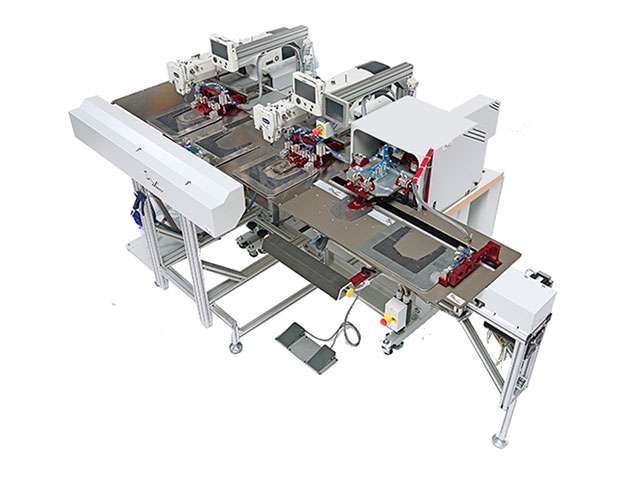 Unidad automática y programable para plegado y costura de bolsillos para tejano y pantalón con dos cabezales de costura.