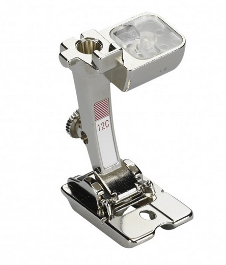 Prensatelas Nº12 C: su ranura ancha en la suela hace que sea más adecuado para coser tejidos de género de punto pesado y para cuero. Además también tiene un lado más largo que otro para coser telas gruesas e irregulares con mayor facilidad, tiene asimismo un orificio de guía para coser con un hilo de refuerzo, también es muy práctico para fijar cordones gruesos y perlas.