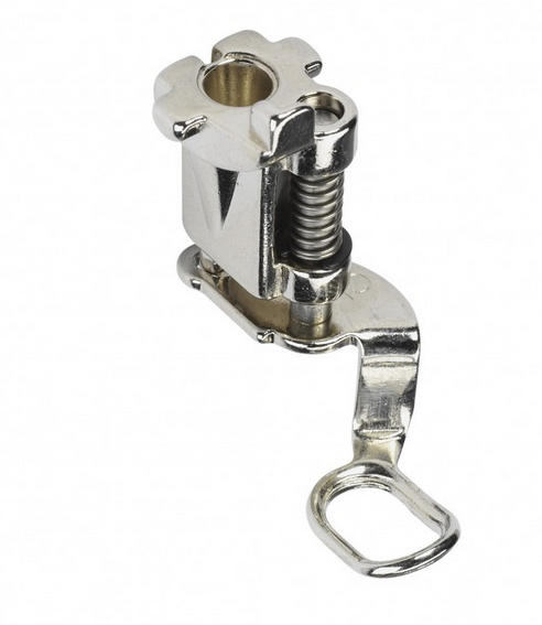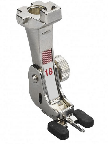 Prensatelas Nº 18: este prensatelas es el indicado para coser botones, botones de presión y ojetes. Tiene suela antideslizante para mantener firmemente el botón en el lugar deseado. Tiene un dedo central extra, con el se ajusta flexiblemente la altura del cuello. Con el también podremos fijar adornos decorativos con lentejuelas o mallas.