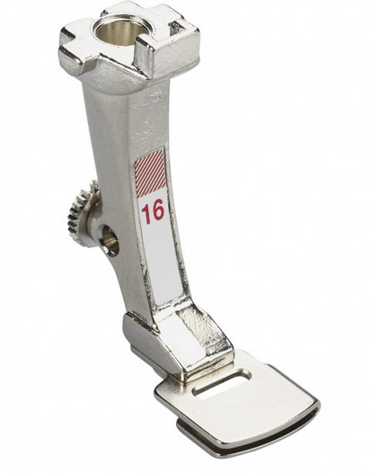 Prensatelas Nº 16: es un prensatelas de fruncido para telas ligeras y semipesadas. Arrastra la tela irregularmente para dejar la tela fruncida. Su ranura permire coser el material fruncido directamente a un trozo de tela lisa de una sola pasada, para ello se introduce la tela en la ranura y no se frunce.