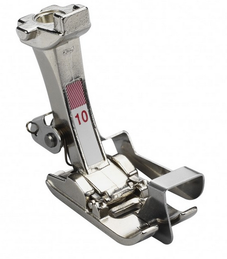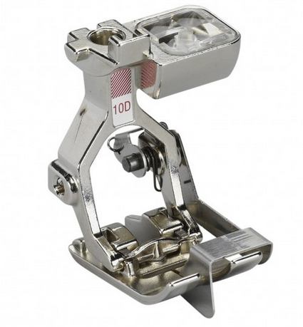 Prensatelas Nº 10D: para orillos estrechos, es un prensatelas práctico para coser orillos acabados de forma uniforme y recta. Es ideal para coser encajes y cintas. Además de pliegues y dobladillos. Gracias a la placa de guía del centro del prensatelas, permite realizar facilmente costuras y dobladillos que discurren paralelamente al orillo.