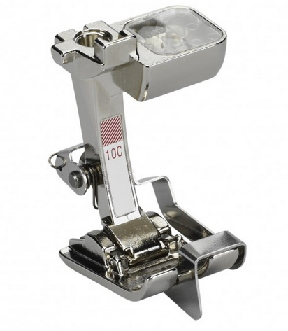 Prensatelas Nº10C: para orillos estrechos, es un prensatelas práctico para coser orillos acabados de forma uniforme y recta. Es ideal para coser encajes y cintas. Además de pliegues y dobladillos. Gracias a la placa de guía del centro del prensatelas, permite realizar facilmente costuras y dobladillos que discurren paralelamente al orillo.