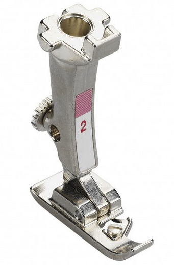 Prensatelas Nº 2: es perfecto para realizar costuras overlock y dobladillos. Es perfecto para sobrehilar costuras sencillas. Las puntadas se forman en la parte interior a través del puente y obtienen así una cantidad de hilo adicional. De esta manera se evita una contracción de la tela. Se genera una costura plana y elástica. También permite coser puños y puntadas de satén de alta calidad en tejidos de punto.