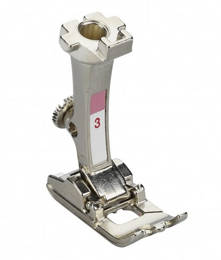 Prensatelas Nº 3: entre los prensatelas de hacer ojales de Bernina, este es el primero, con o sin refuerzo de hilo, también es perfecto para fruncir con hilo. Gracias a sus ranuras laterales se desplaza perfectamente en costuras de satén, dejando un acabado sencillo y nítido.