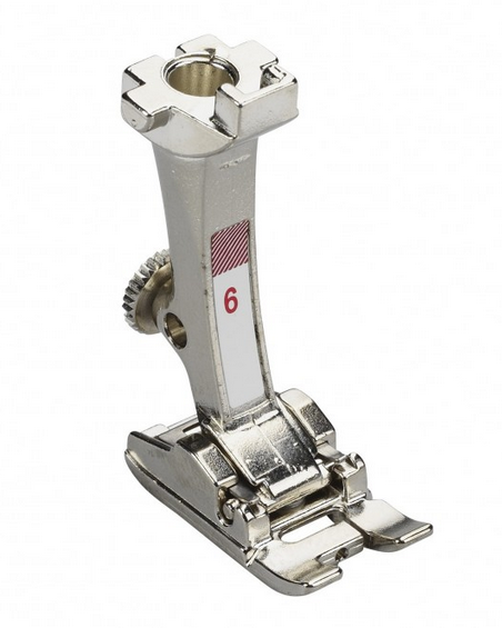 Prensatelas Nº 6: es un prenstelas para trabajar con tejidos gruesos, esto es debido al gran espacio libre para el hilo, también se desliza sin esfuerzo en grandes puntadas debajo de la suela sin que se obstaculice el arrastre de la tela. Además posee un orificio en el centro de la parte delantera del pie hacer pasar hilos de refuerzo o hilos elásticos.