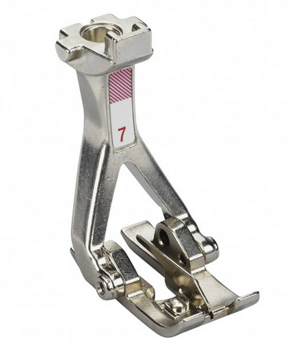 Prensatelas Nº 7: nos sirve para marcar líneas de costura, como para coser adornos, vainicas, flecos y efectos 3D. Al coser dos telas se aflojará un poco la tensión del hilo para que éste se deslice fácilmente sobre la guía del hilo situada en el centro del prensatelas. La puntada en zigzag crea bucles sueltos que se deslizan hacia atrás por la abertura especial en forma de V del prensatelas. Después de coser se abre la tela con cuidado y se decora con costuras decorativas.