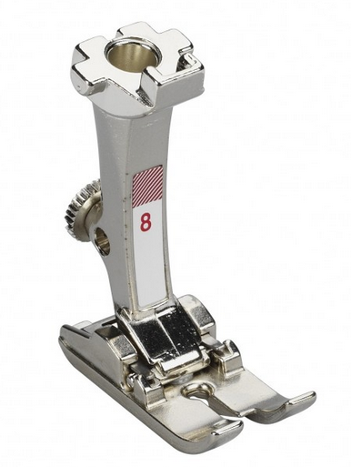 Prensatelas Nº 8: para puntadas rectas en materiales gruesos como el tejido vaquero o la lona y finos como el lino. El orificio de puntada le proporciona a la aguja la máxima estabilidad posible, mientras que la suela plana del pie le permite deslizarse fácilmente sobre capas gruesas de tela.