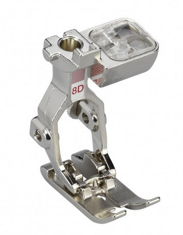 Prensatelas Nº 8D: es indicaado para jeans y para puntadas rectas en materiales gruesos como el tejido vaquero o la lona y finos como el lino. El orificio de puntada le proporciona a la aguja la máxima estabilidad posible, mientras que la suela plana del pie le permite deslizarse fácilmente sobre capas gruesas de tela.