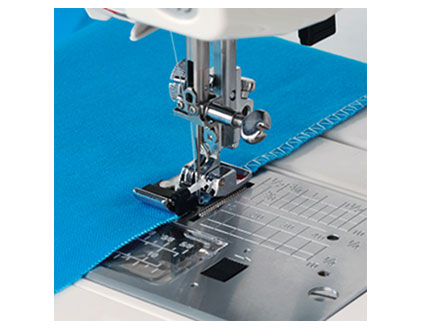 El prensatelas va guiando la tela manteniendo los bordes planos compensando la falta de fricción cuando la aguja realiza la puntada mas a la derecha.