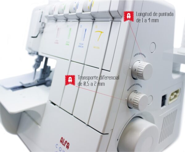 Controles de fácil acceso. Costura de cadena, con capacidad para hacer una puntada de cadena de 1 aguja, 2 hilos.