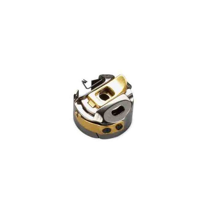Se distingue del canillero normal de costura por el pestillo dorado y el guía hilo adicional.