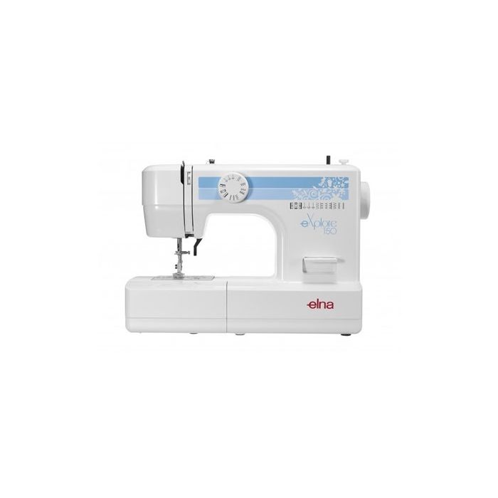Máquina de coser Elna 150eX, máquina de brazo libre, sencilla y práctica de manejar para quienes necesitan una máquina que realice solamente las funciones básicas de toda máquina de coser. 6 funciones. El uso de la máquina es muy sencillo, para principiantes es perfecto. Ofrece todas las funciones necesarias para la realización de sus labores. El sistema de gancho giratorio horizontal va a facilitar la canilla y el suministro de hilo bajo control en todo momento.