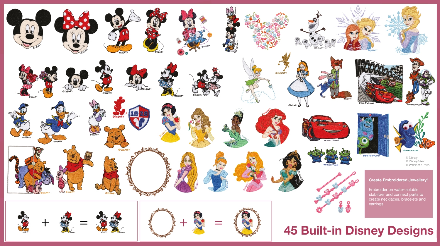 10 fuentes incluidas, 125 bordados con 45 personajes de Disney. Enmarcados de bordados Disney con 14 estilos de puntadas que pueden ser combinados con 10 formas diferentes de marcos ( circulares uy cuadrados ).