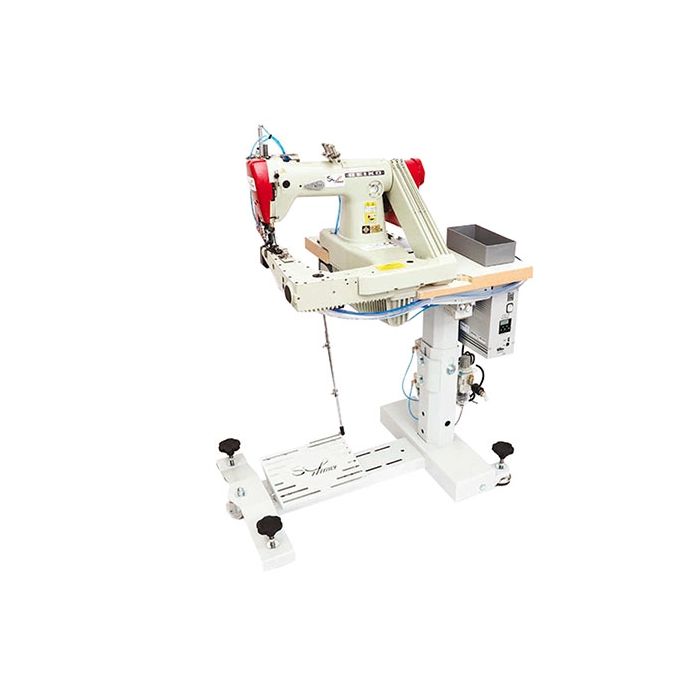Máquina de brazo con puller neumático para el cierre de perneras de pantalón tejano.