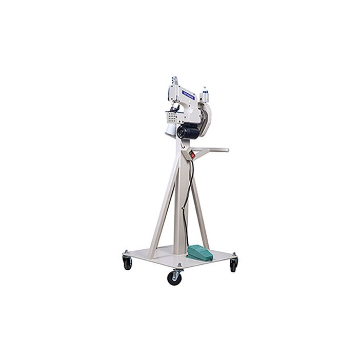Máquina para cerrar sacos de una aguja, cose una cadeneta simple, con bancada de 4 ruedas y mango para su desplazamiento. Interruptor por pedal opcional.