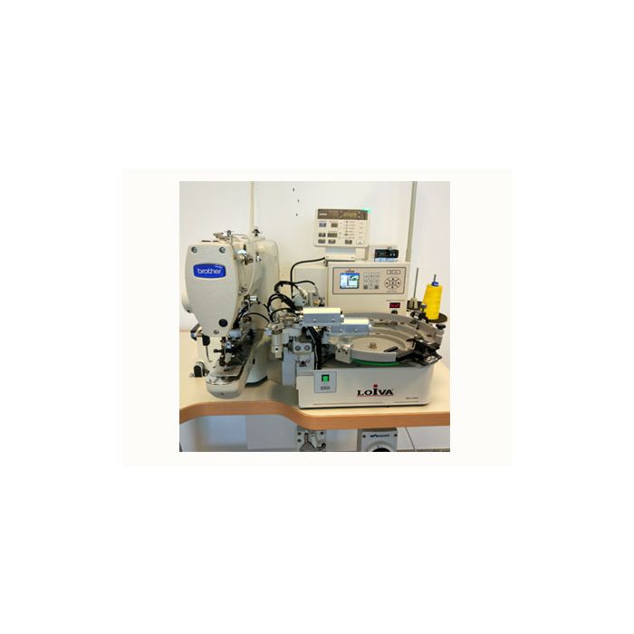 Máquina de botones electrónica con motor Direct Drive BE-438FX con alimentador automático de botones LOIVA. Sistema electro-mecánico y neumático que alimenta la máquina de coser a través de un clamp de botones. El operador no necesita alinear los orificios del botón. Gracias al alimentador podrá utilizar la cabeza de la máquina al máximo de su velocidad aumentando su productividad.