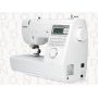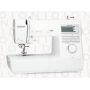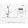 En la pantalla LCD podremos ver el prénsatelas que tenemos que colocar para la puntada que vayamos a realizar y en que posición esta situado ( arriba o abajo), si esta activada la función del posicionador de aguja y la función de remate, ademas del número de puntada seleccionada. Al lado derecho están dibujados los símbolos del largo y corto y ancho y estrecho para cambiarlos en cada botón que esta al lado de estos. Cuenta ademas con el botón de doble aguja y debajo de este el de remate para que la maquina coser cosa al revés automáticamente hasta que nosotros detengamos.