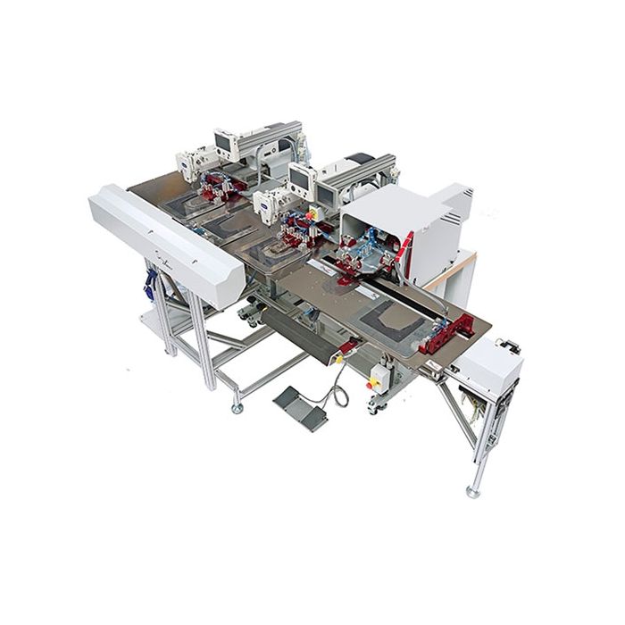 Unidad automática y programable para plegado y costura de bolsillos para tejano y pantalón con dos cabezales de costura.