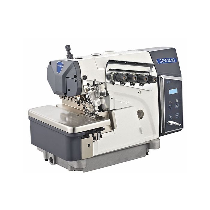 Máquina overlock de alta velocidad 7000 ppm, de 2 agujas y 4 hilos, 2mm de separacion entre las agujasy 4mm de ancho de sobrehilado (total 6mm). Equipada con alzaprensatelas electrónico, motor, caja de control y panel en cabezal.