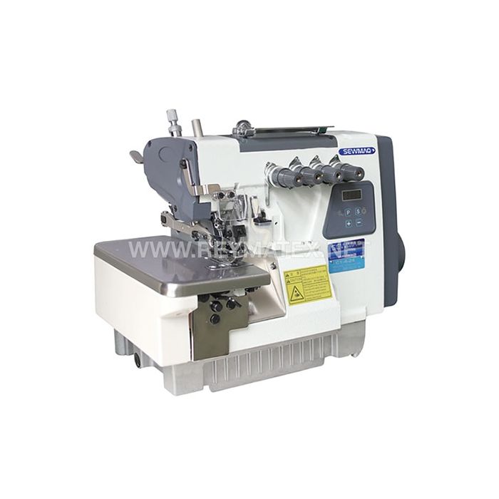 Máquina overlock de 2 agujas 5 hilos (3x4) alta velocidad 6.000 PPM. Equipada con motor servo, caja de control y panel incorporados en el cabezal. Incluye luz de LEDs.