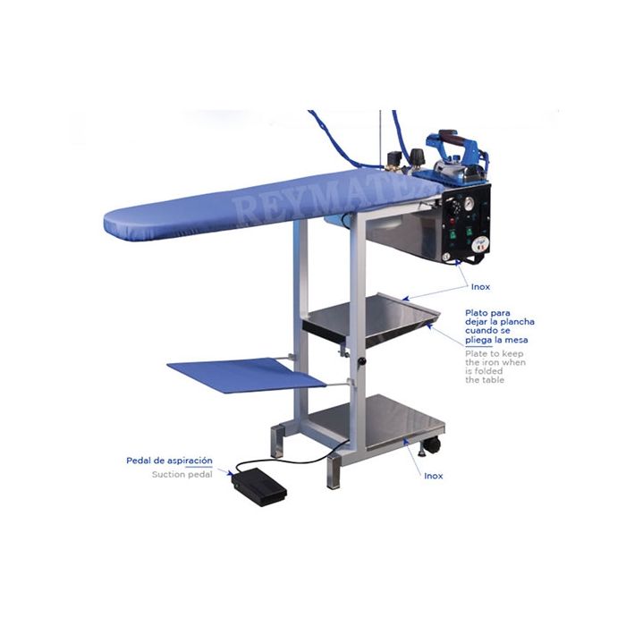 Mesa de planchar de plato universal plegable, con caldera de 5 litros de acero inoxidable, aspiración, soplado, plato calentado de nivel de agua y plancha de mano industrial con mango de madera. Medidas del plato: 110x22-35 cm.