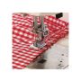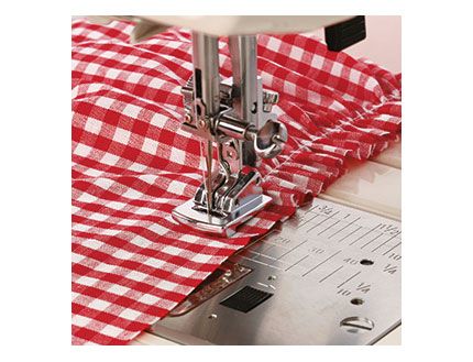 Este prensatelas sirve para realizar fruncidos suaves en telas finas. La parte inferior del prenatales esta sobrrealzada detrás de la aguja y tiene una barra gruesa frente a la aguja para fruncir y poner un volante en una pieza plana al mismo tiempo.
