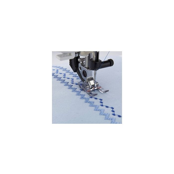 Este prénsatelas es el ideal para apliques y otras costuras que necesiten una amplia visión sin obstáculos en la zona de costura.