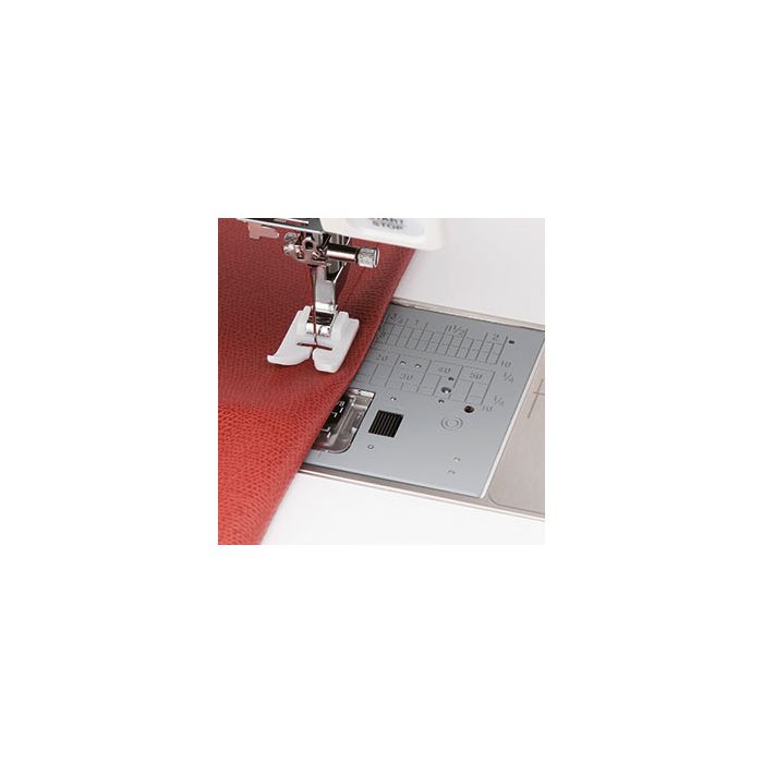 El prensatelas ultra deslizante, moldeado en una resina especial que permite coser más fácilmente los materiales engomados, desliza suavemente junto