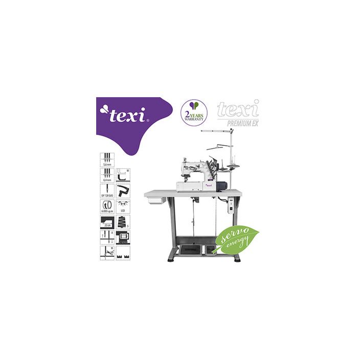 Máquina de coser industrial de 3-agujas, con capacidad de 5 hilos, base plana máquina de recubrimiento. Equipada con aguja del calibre 5,6 mm y una lámpara LED de ahorro de energía para la iluminación del campo de trabajo. Incluye aguja de calibre adicional de 6,4 mm (pie, placa de agujas, delantera y transporte trasero, soporte de la aguja).